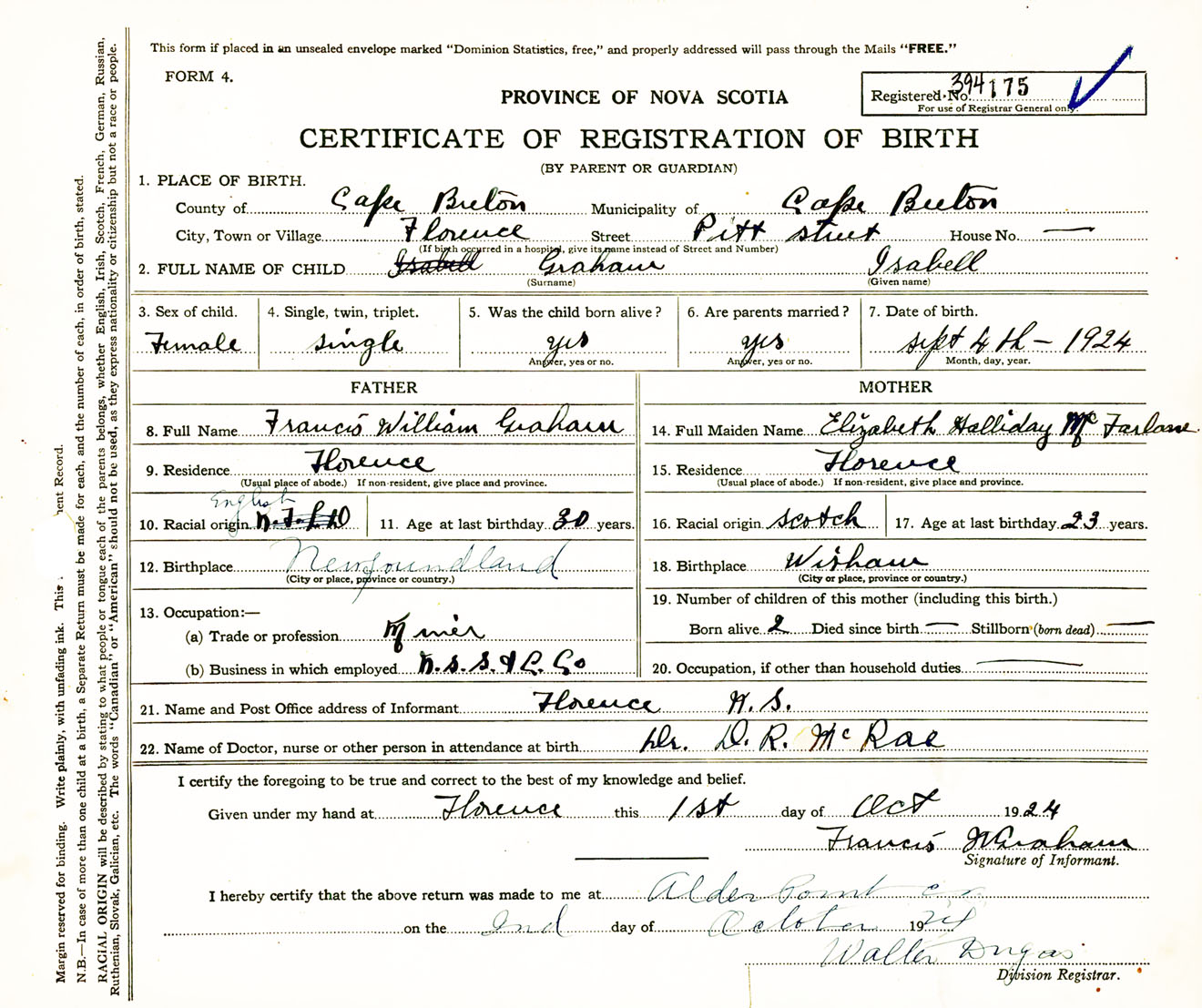 Female Birth Registration: Year: 1924 number: 39400175