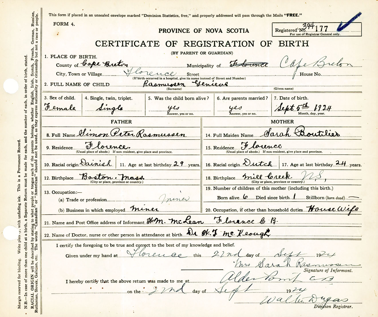 Female Birth Registration: Year: 1924 number: 39400177