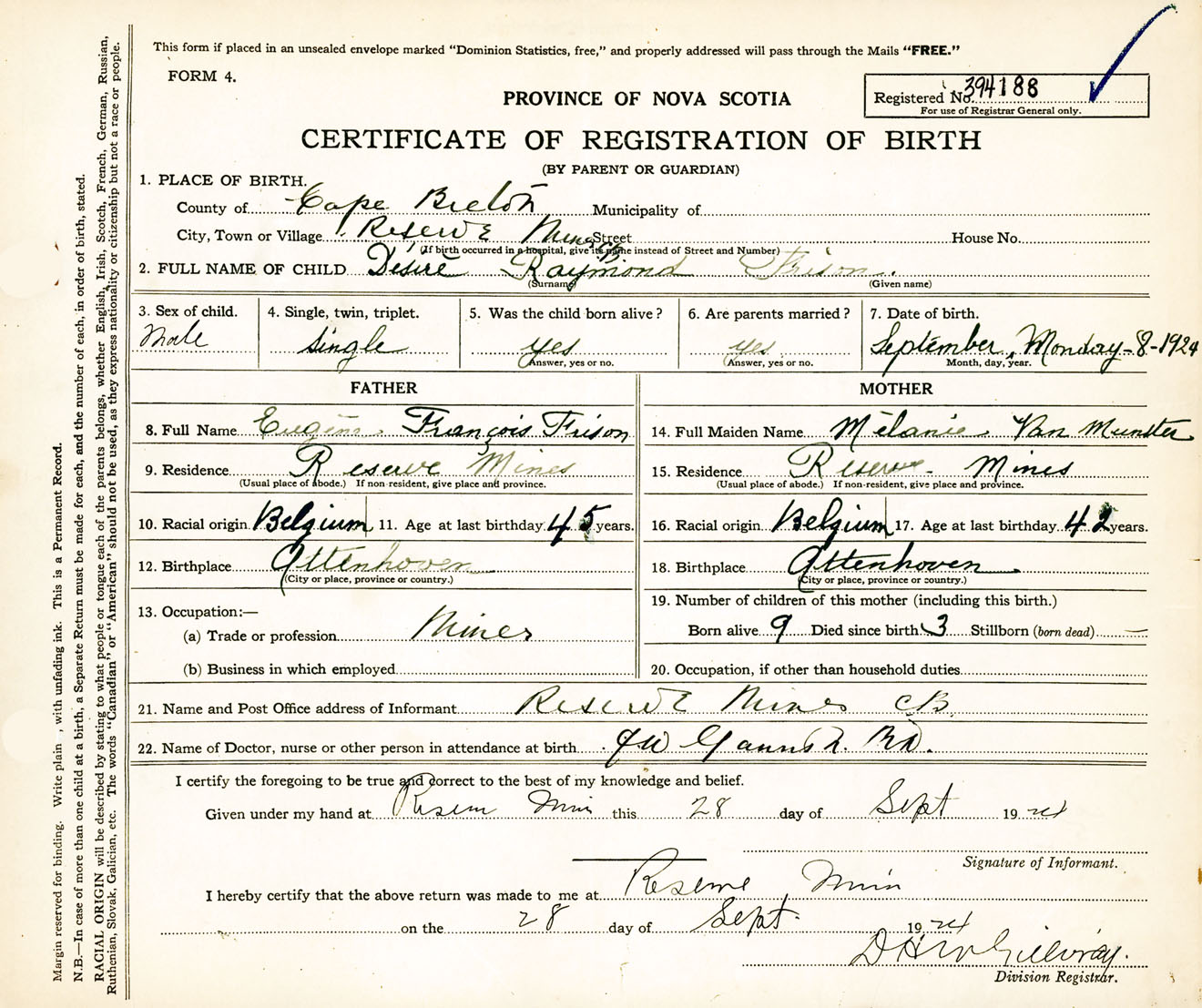 Male Birth Registration: Year: 1924 number: 39400188