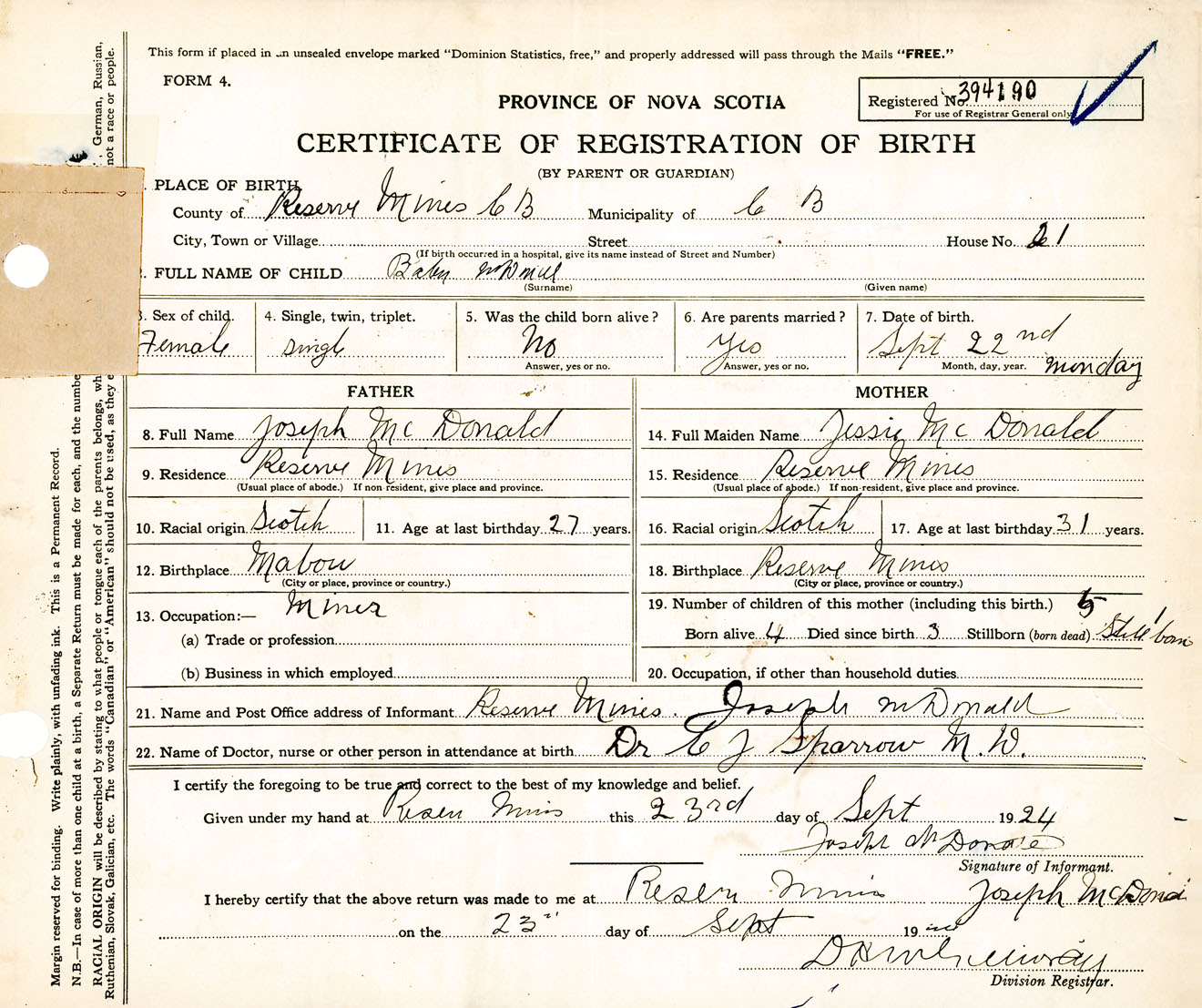 Female Birth Registration: Year: 1924 number: 39400190