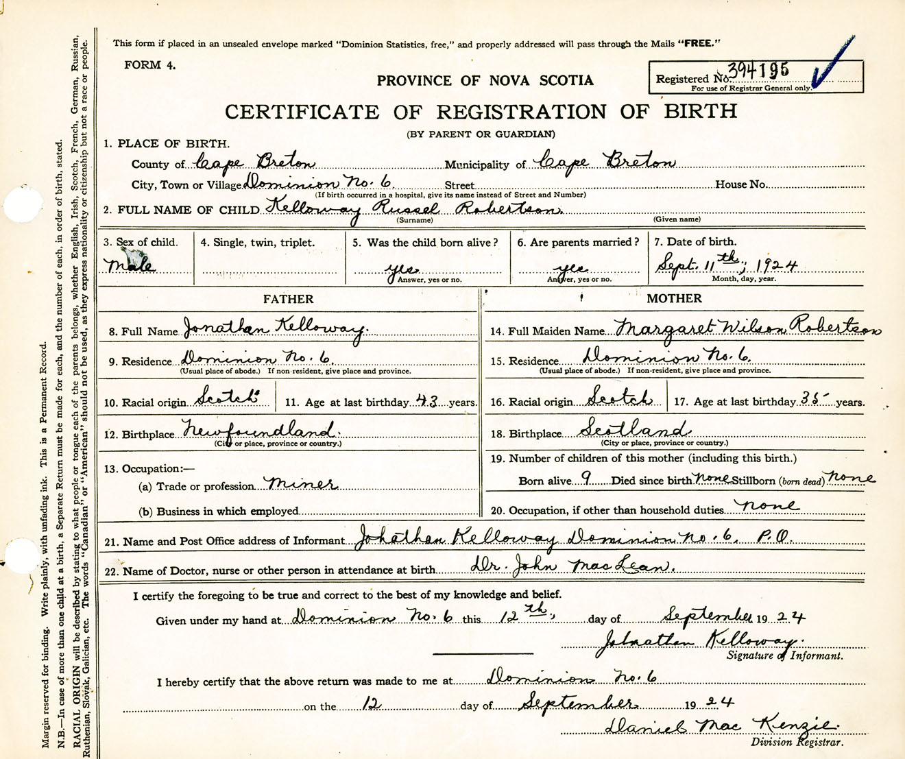 Male Birth Registration: Year: 1924 number: 39400195