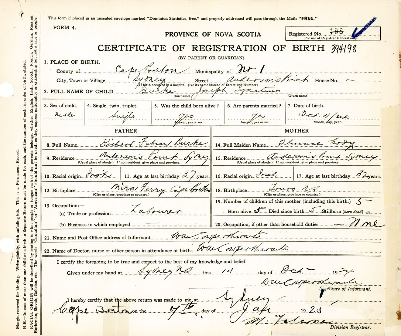 Male Birth Registration: Year: 1924 number: 39400198