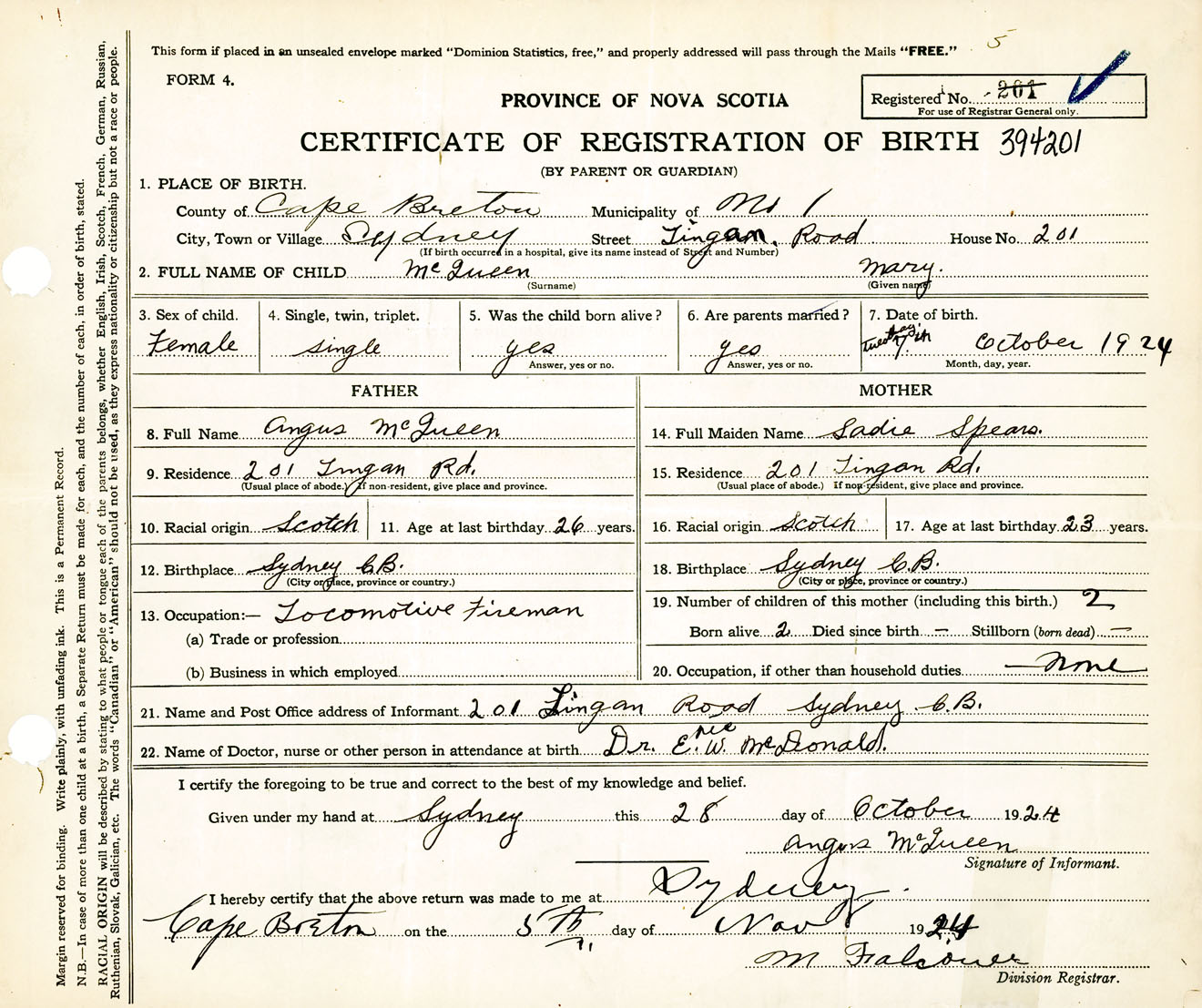 Female Birth Registration: Year: 1924 number: 39400201