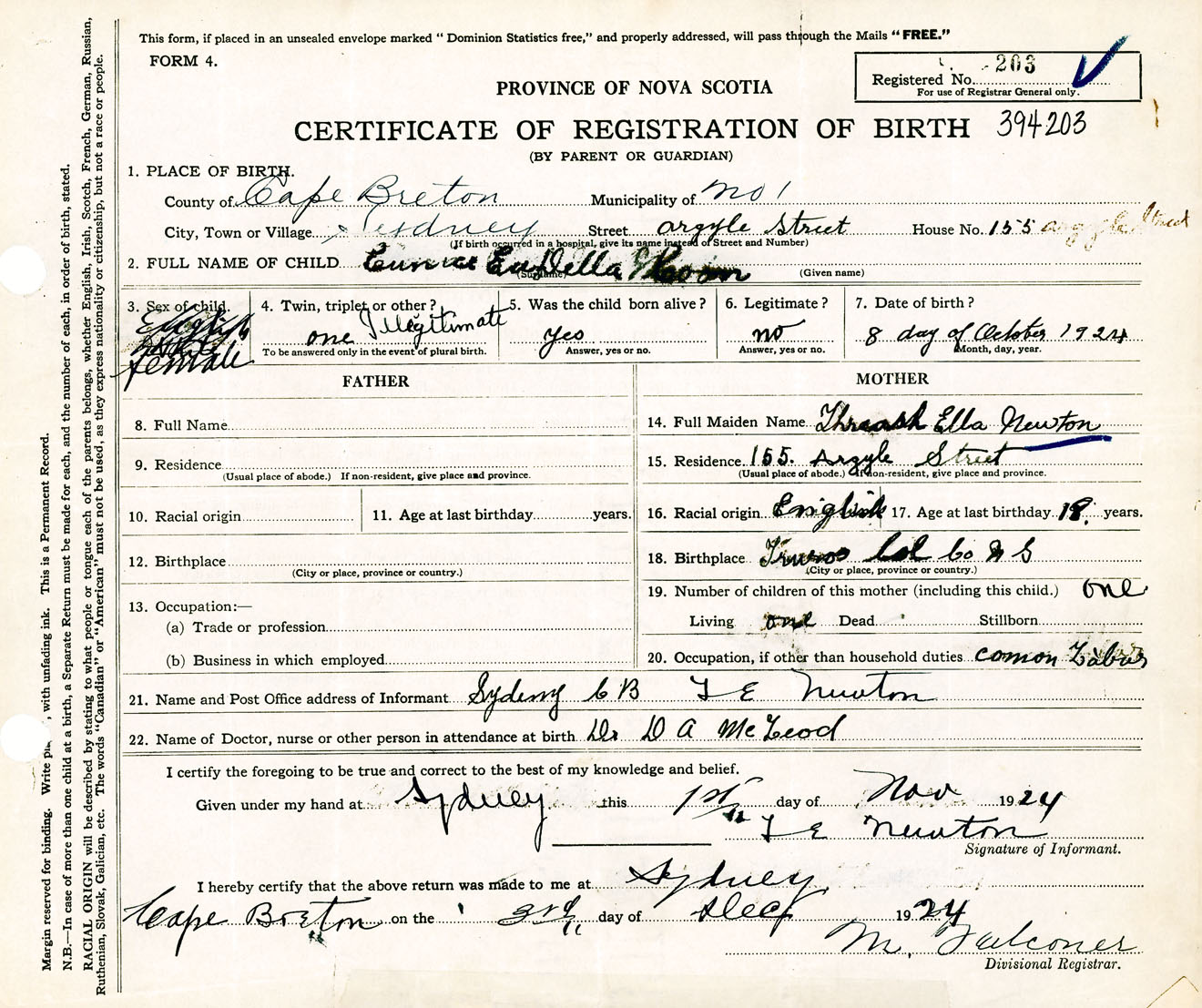 Female Birth Registration: Year: 1924 number: 39400203