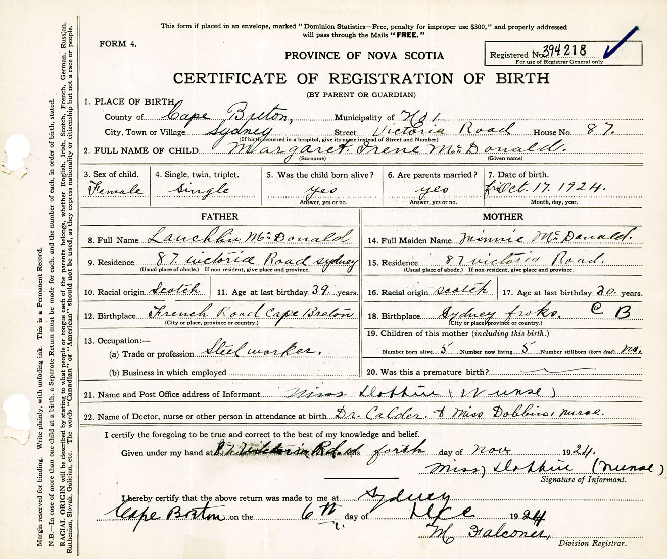 Female Birth Registration: Year: 1924 number: 39400218