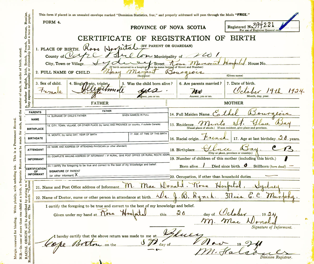 Female Birth Registration: Year: 1924 number: 39400221