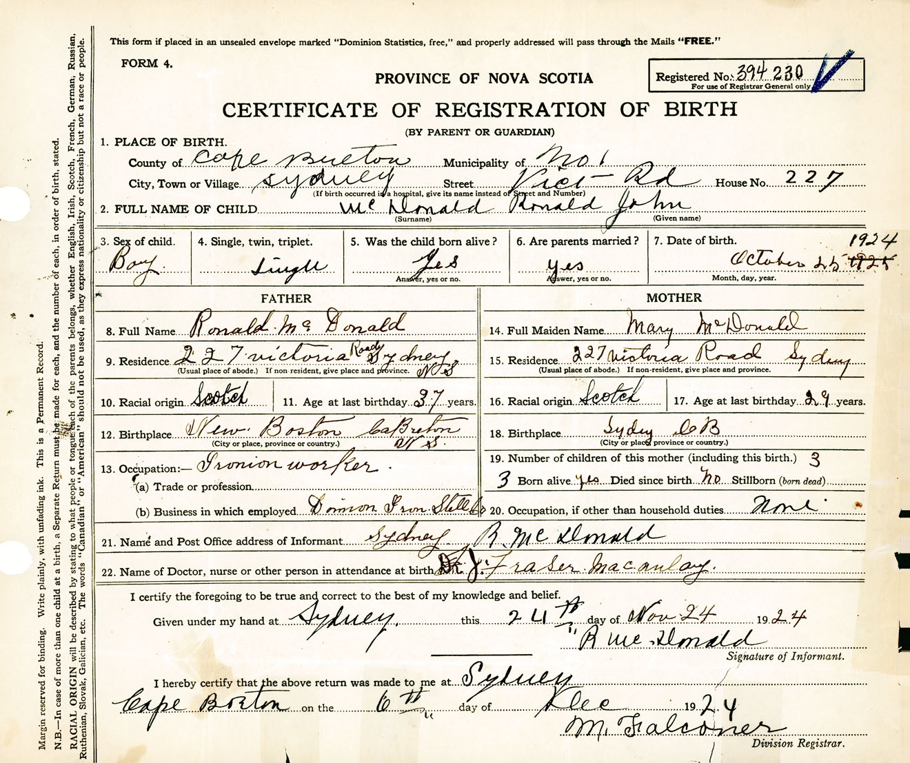 Male Birth Registration: Year: 1924 number: 39400230