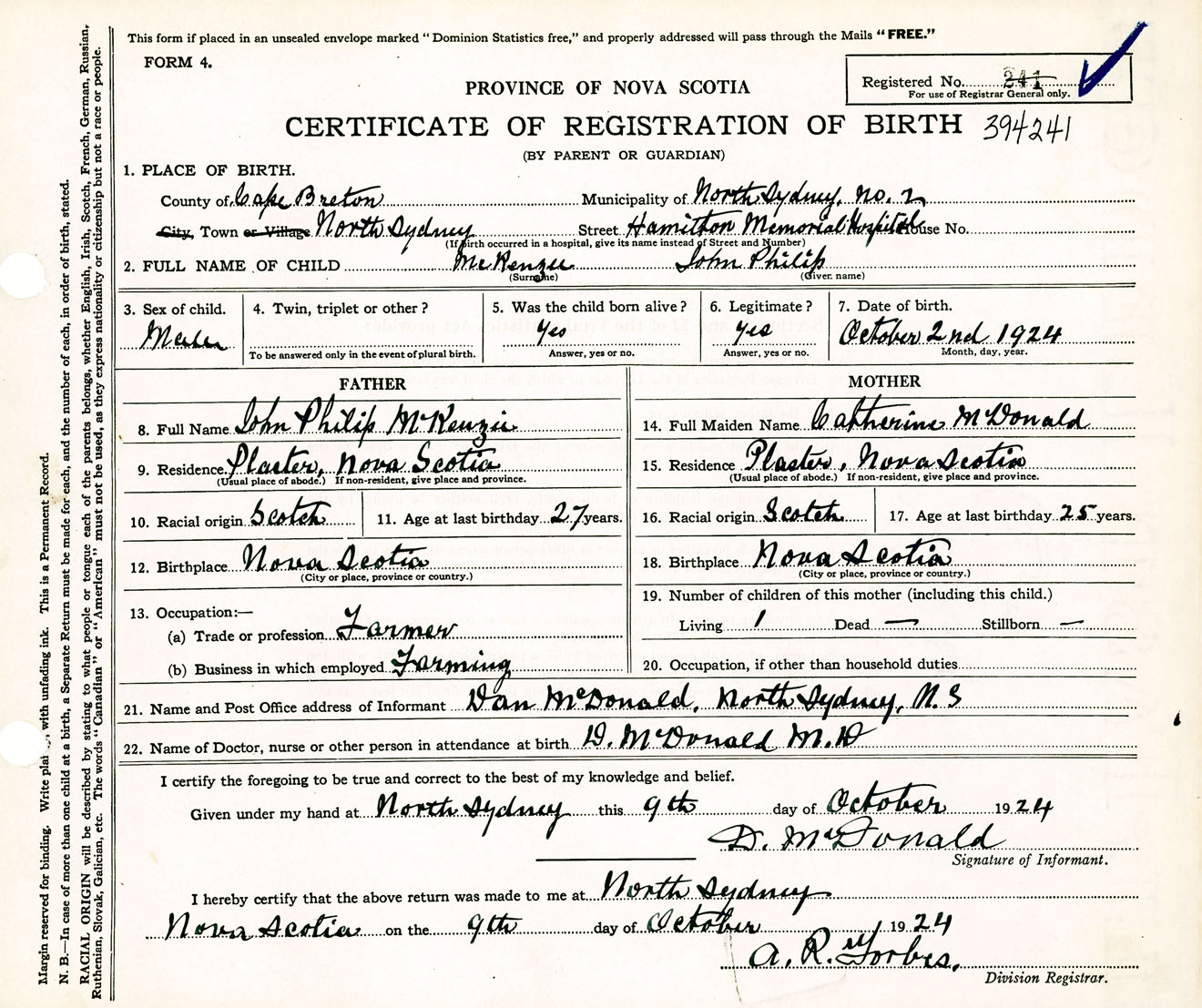 Male Birth Registration: Year: 1924 number: 39400241