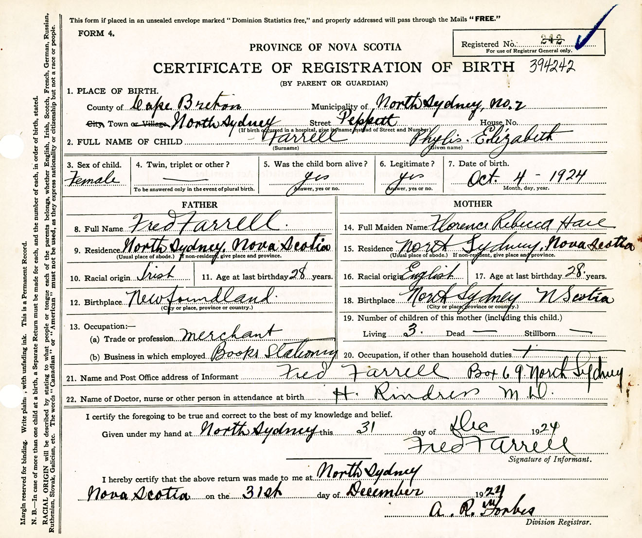 Female Birth Registration: Year: 1924 number: 39400242