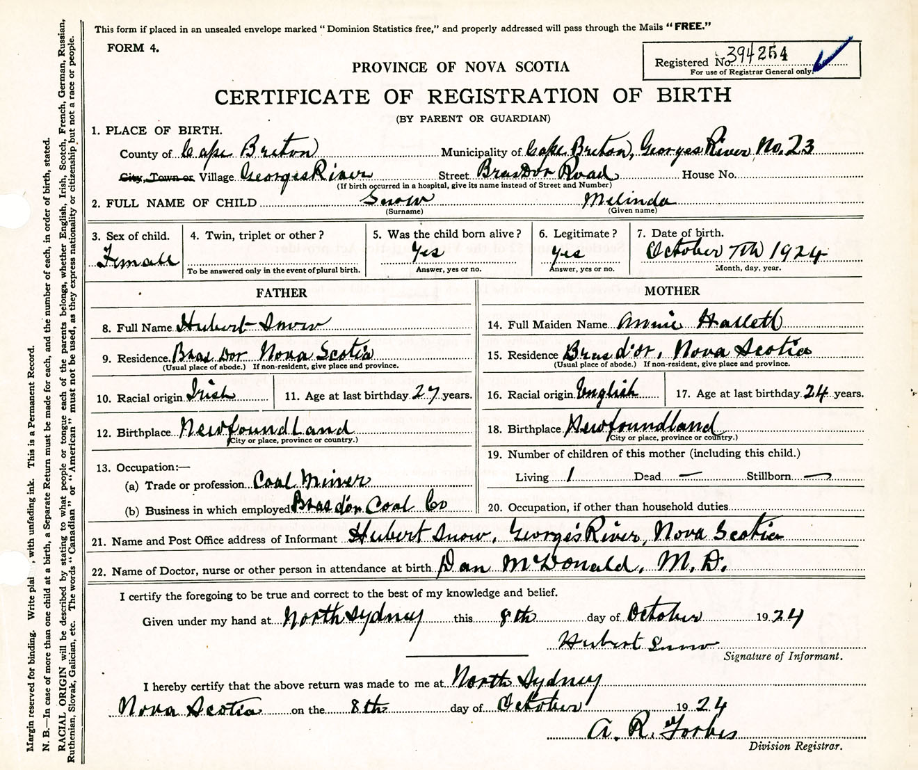 Female Birth Registration: Year: 1924 number: 39400254