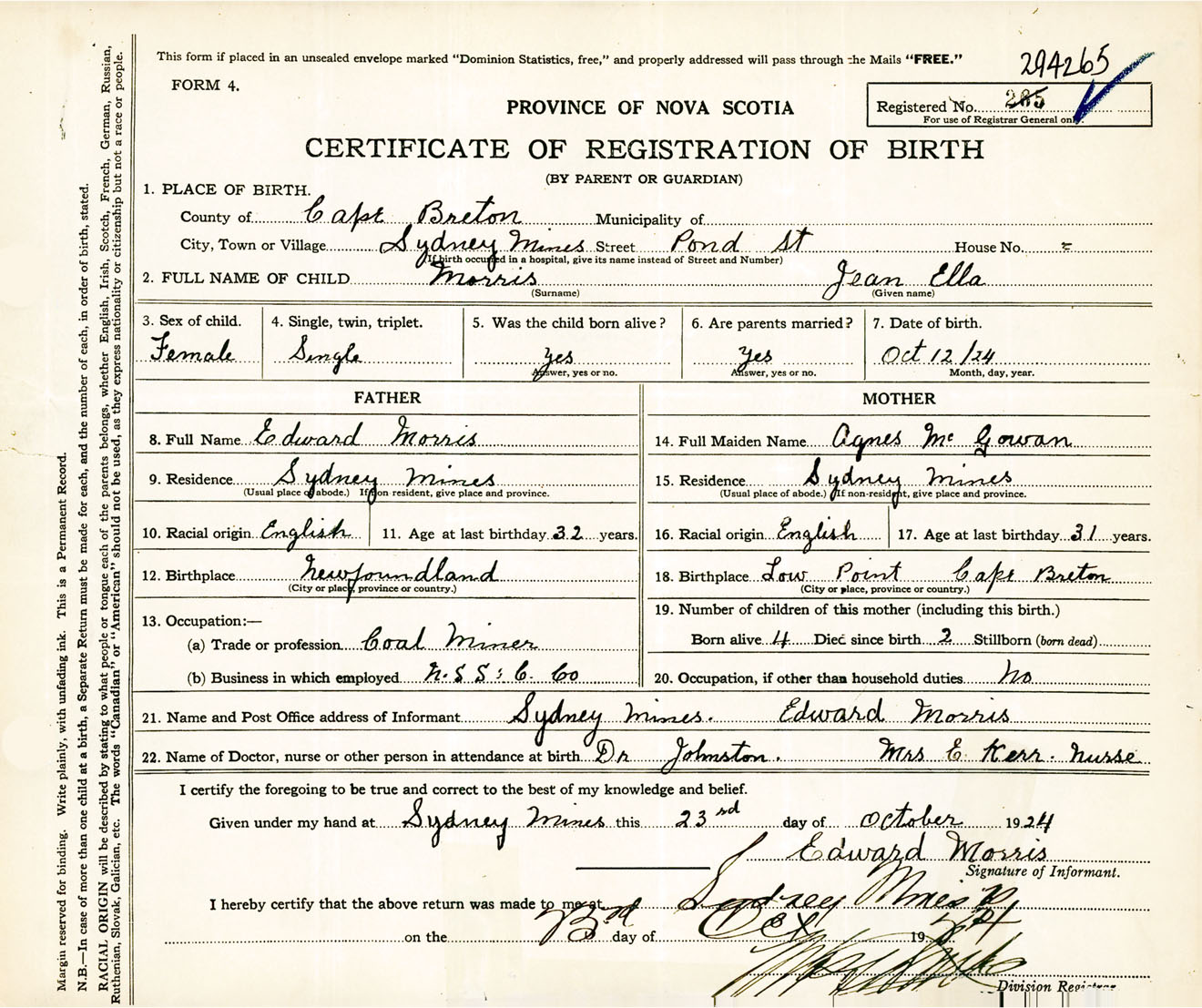 Female Birth Registration: Year: 1924 number: 39400265