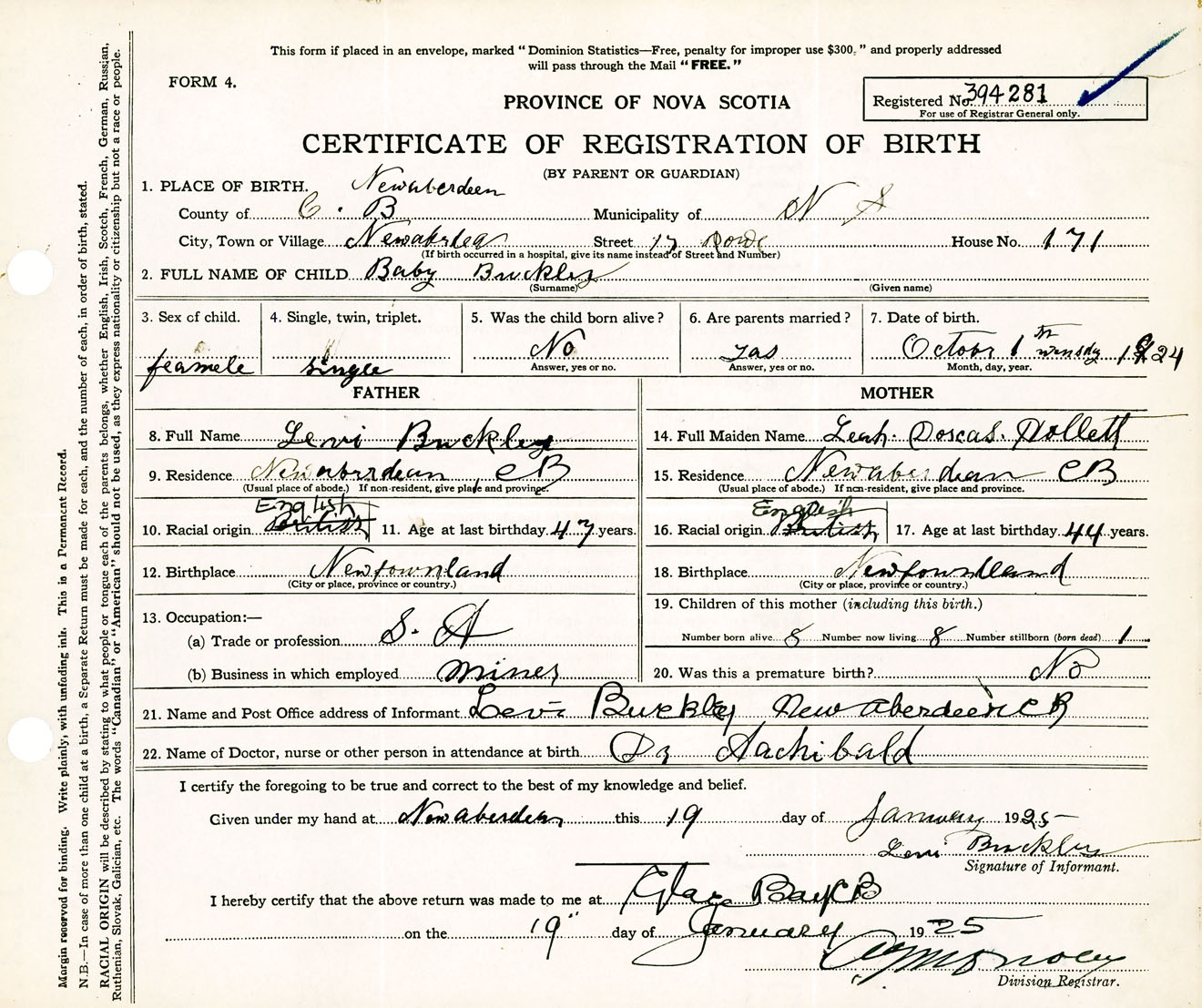 Female Birth Registration: Year: 1924 number: 39400281