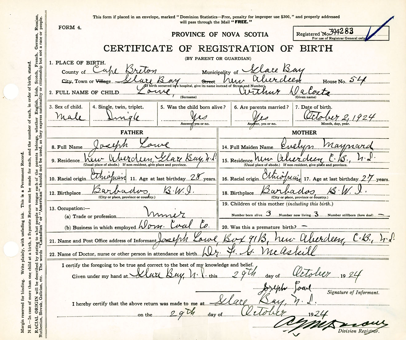 Male Birth Registration: Year: 1924 number: 39400283