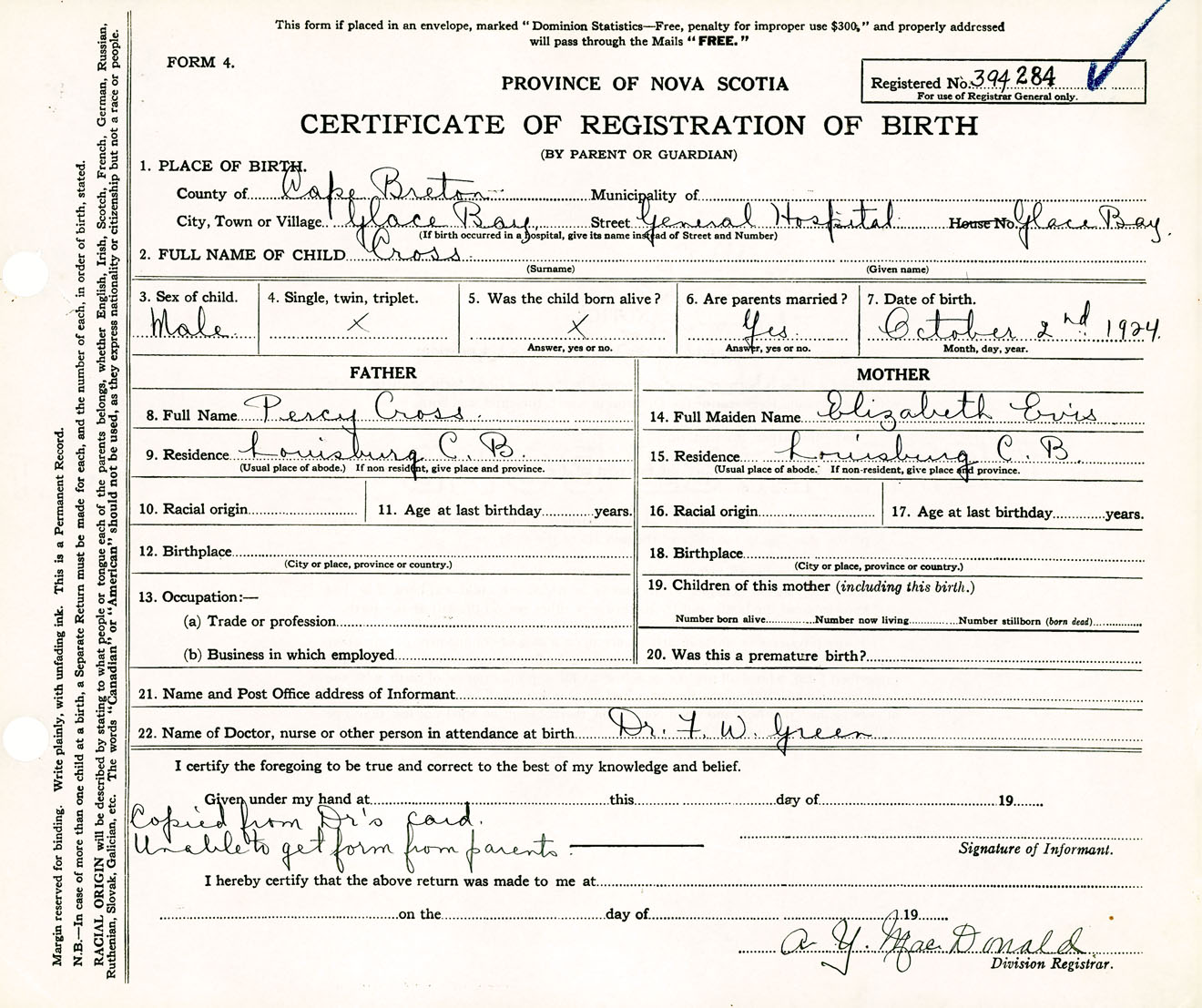 Male Birth Registration: Year: 1924 number: 39400284