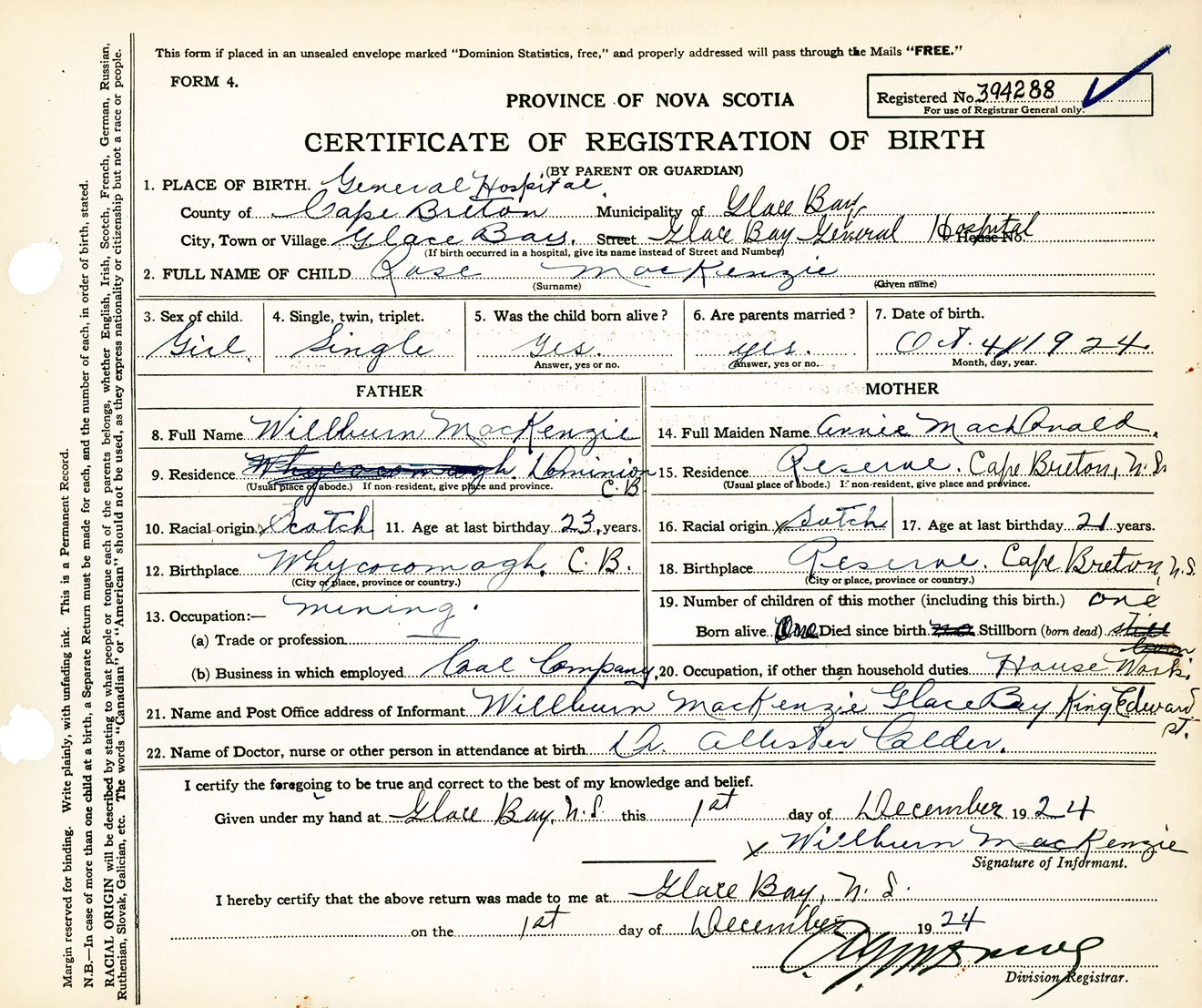 Female Birth Registration: Year: 1924 number: 39400288