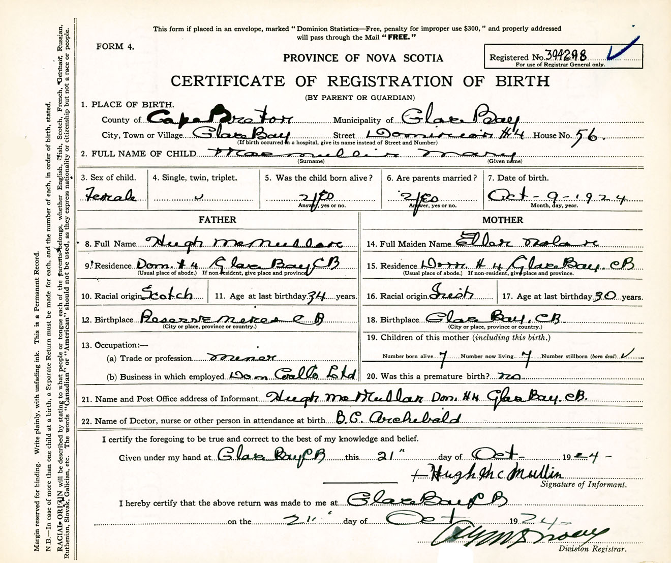 Female Birth Registration: Year: 1924 number: 39400298