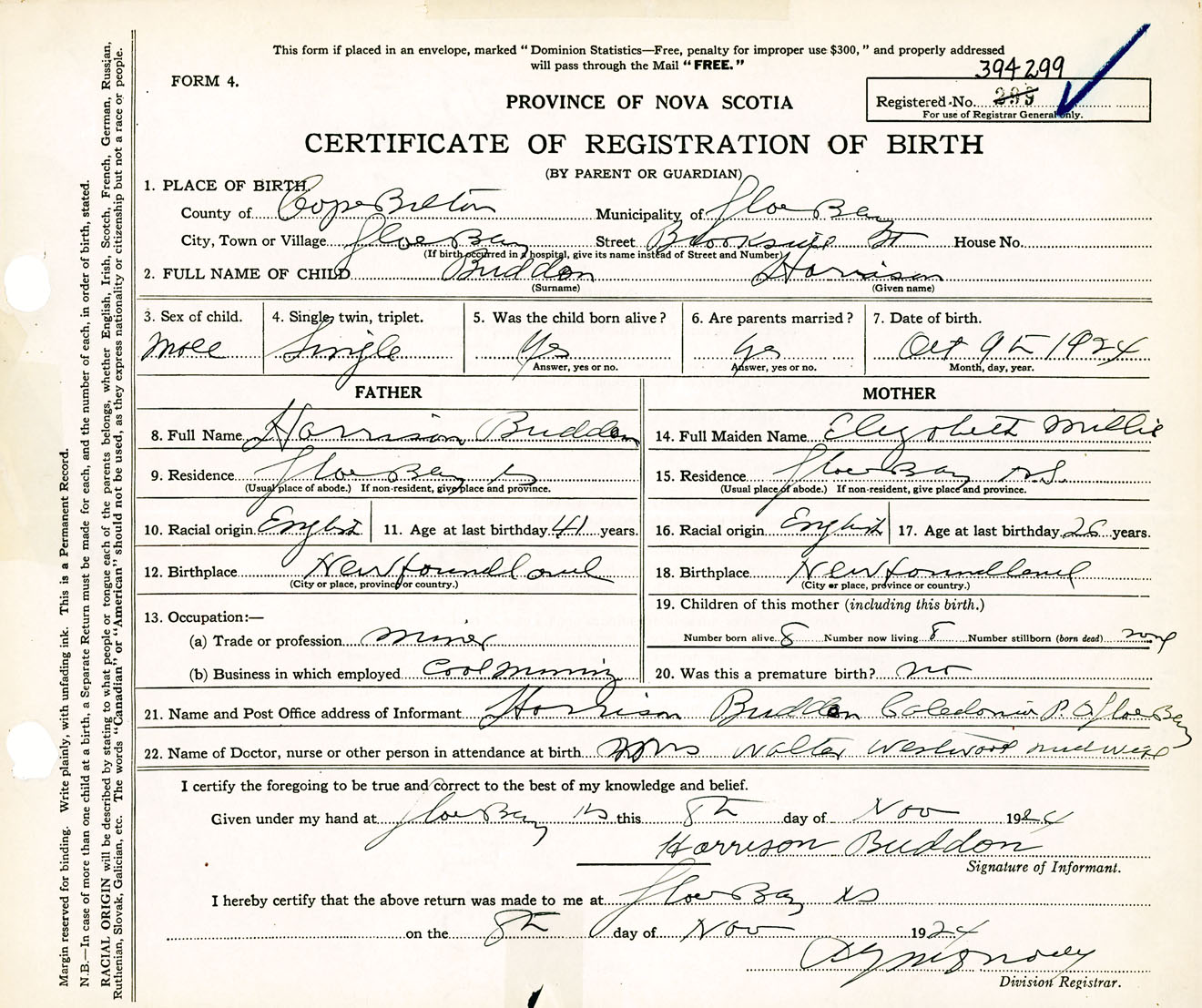 Male Birth Registration: Year: 1924 number: 39400299