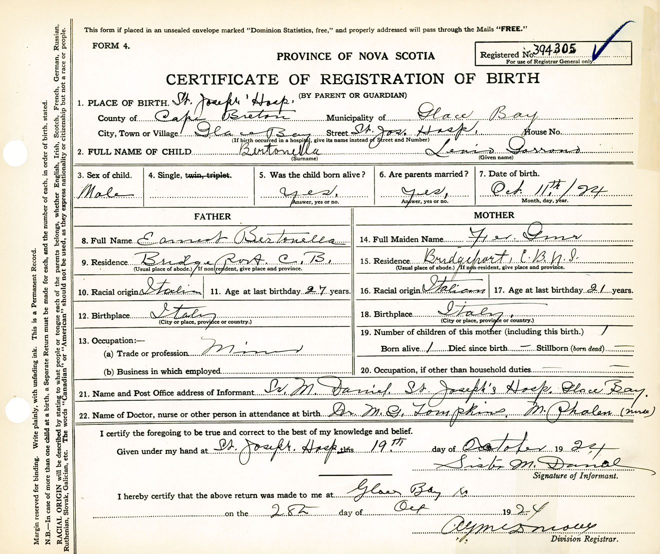 Male Birth Registration: Year: 1924 number: 39400305