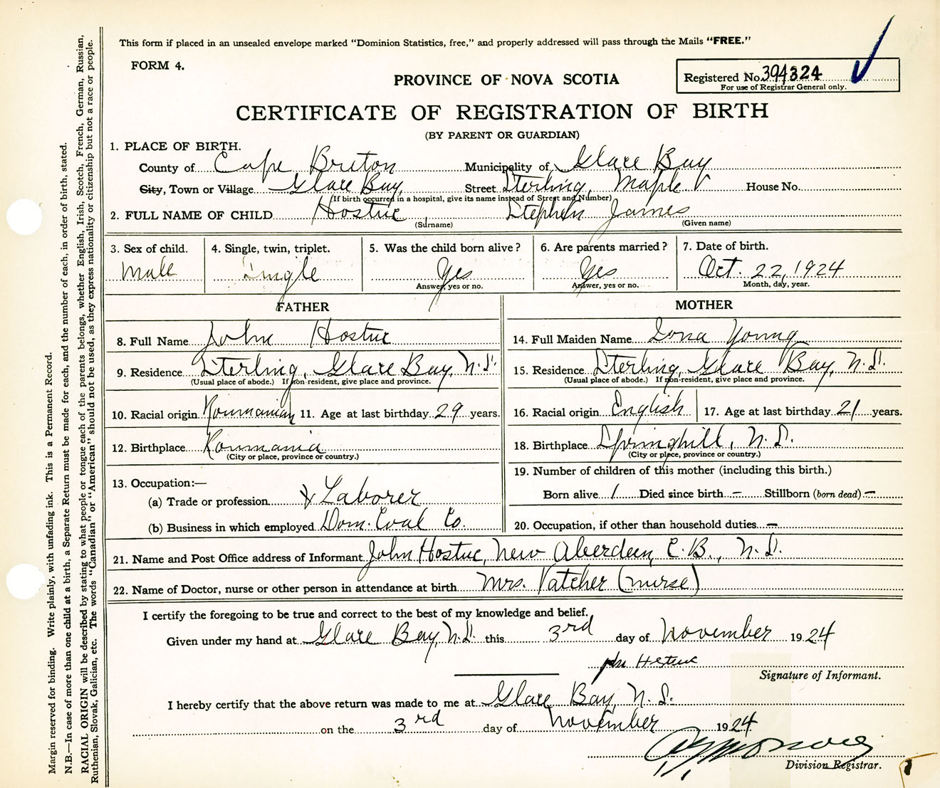 Male Birth Registration: Year: 1924 number: 39400324