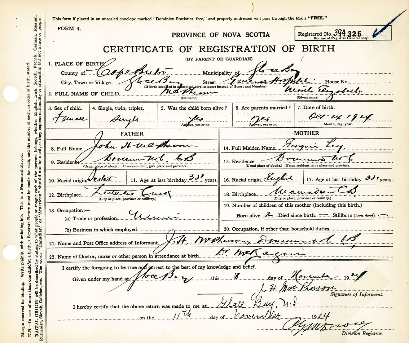 Female Birth Registration: Year: 1924 number: 39400326