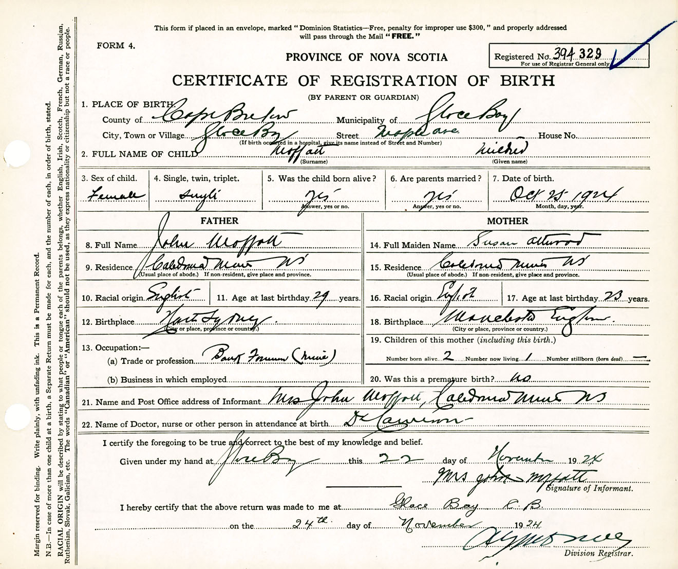 Female Birth Registration: Year: 1924 number: 39400329