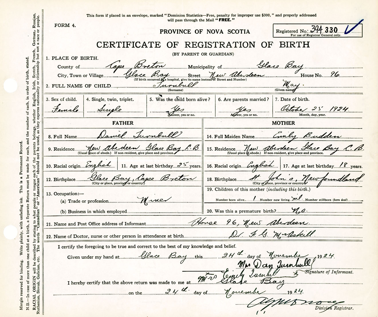 Female Birth Registration: Year: 1924 number: 39400330