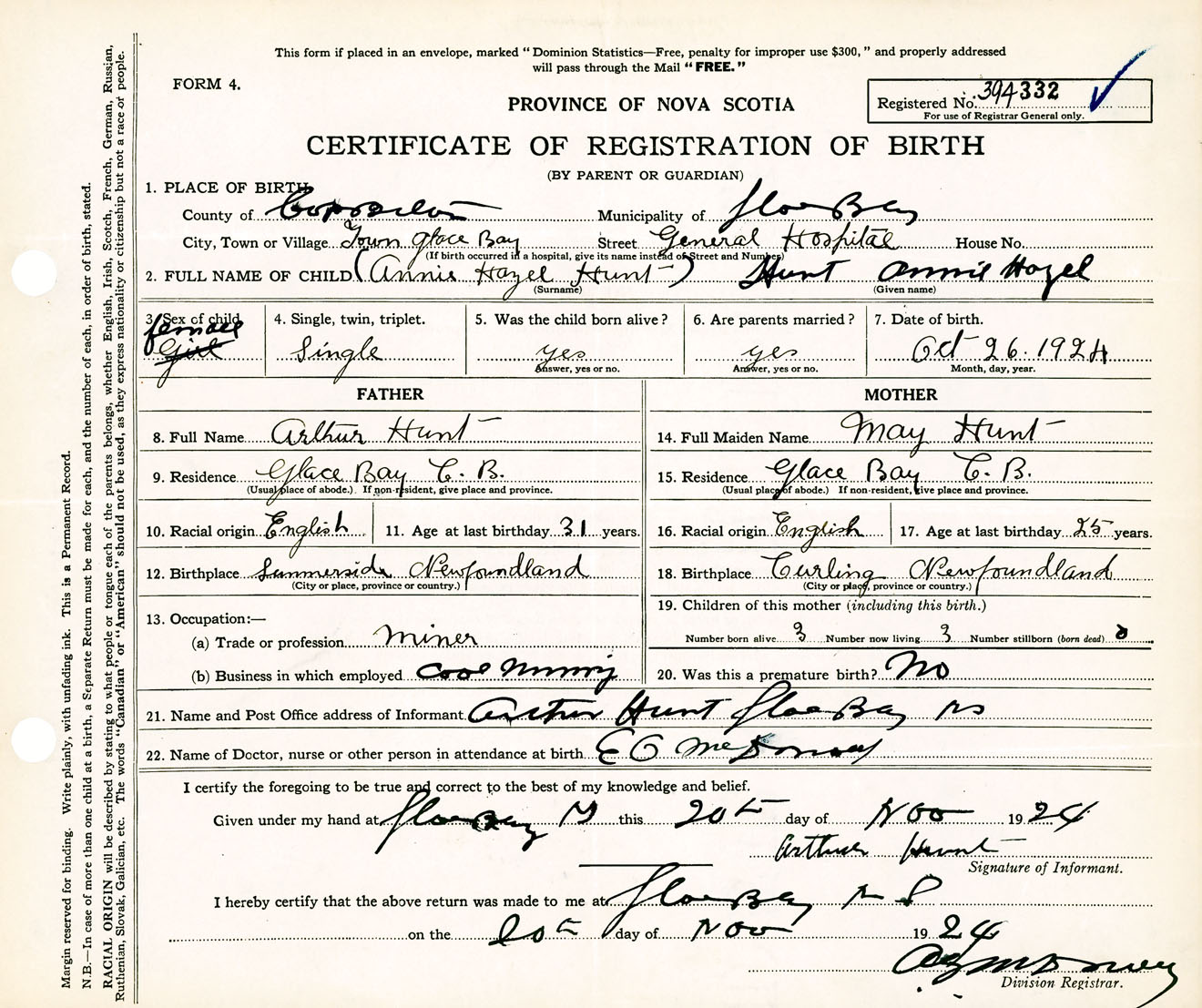 Female Birth Registration: Year: 1924 number: 39400332