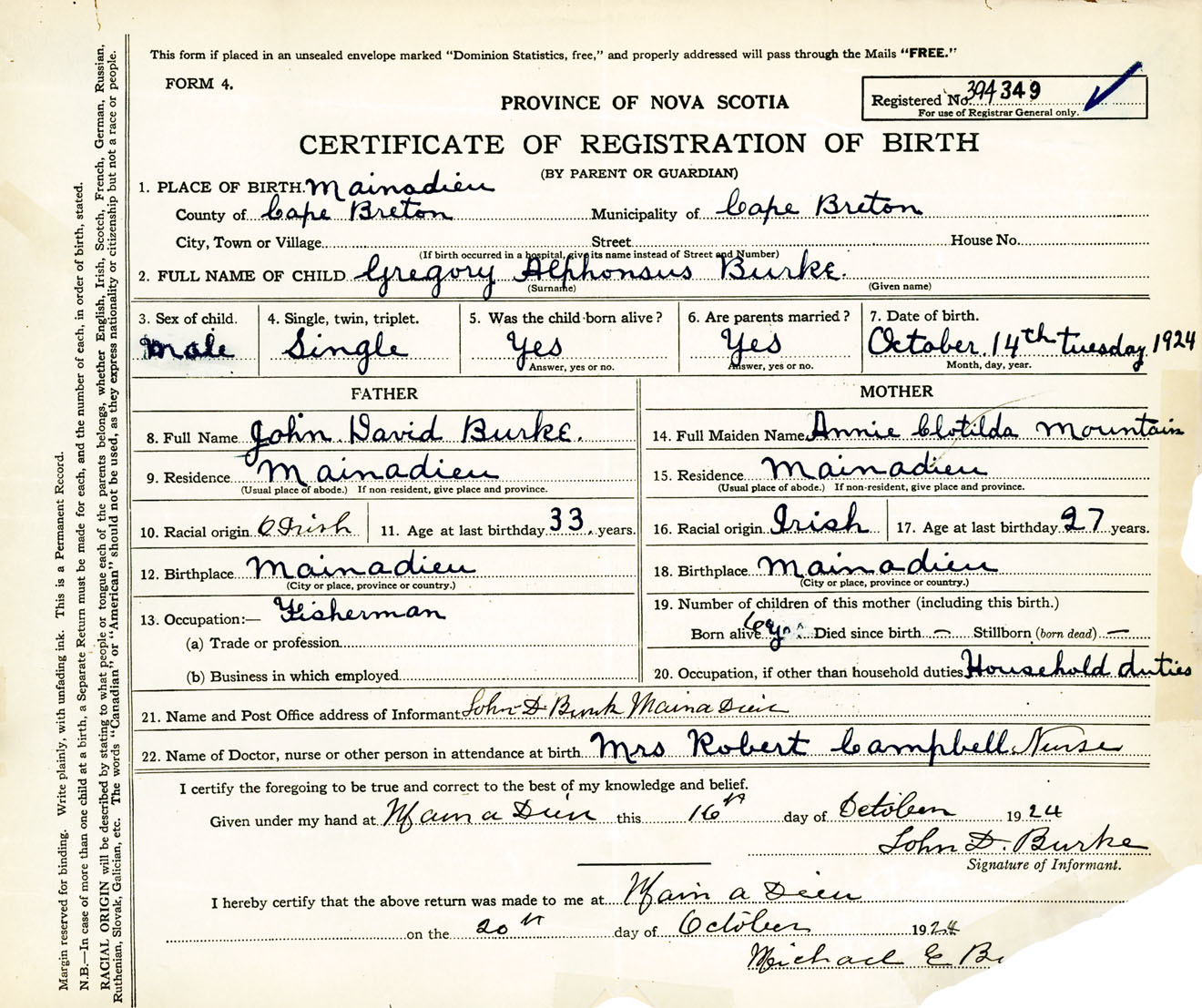 Male Birth Registration: Year: 1924 number: 39400349
