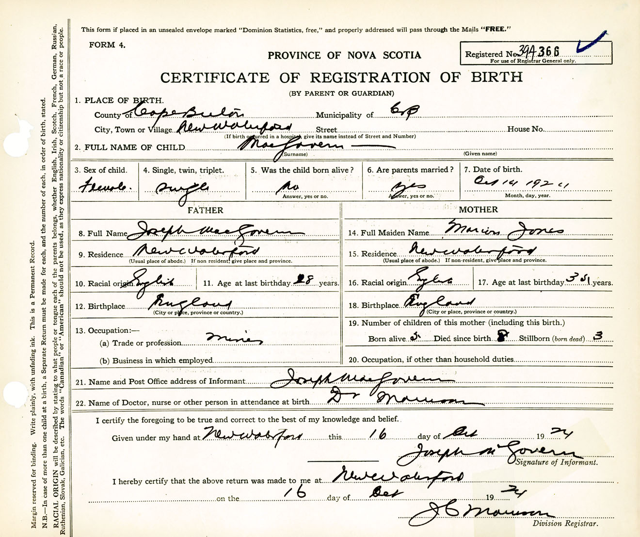 Female Birth Registration: Year: 1924 number: 39400366