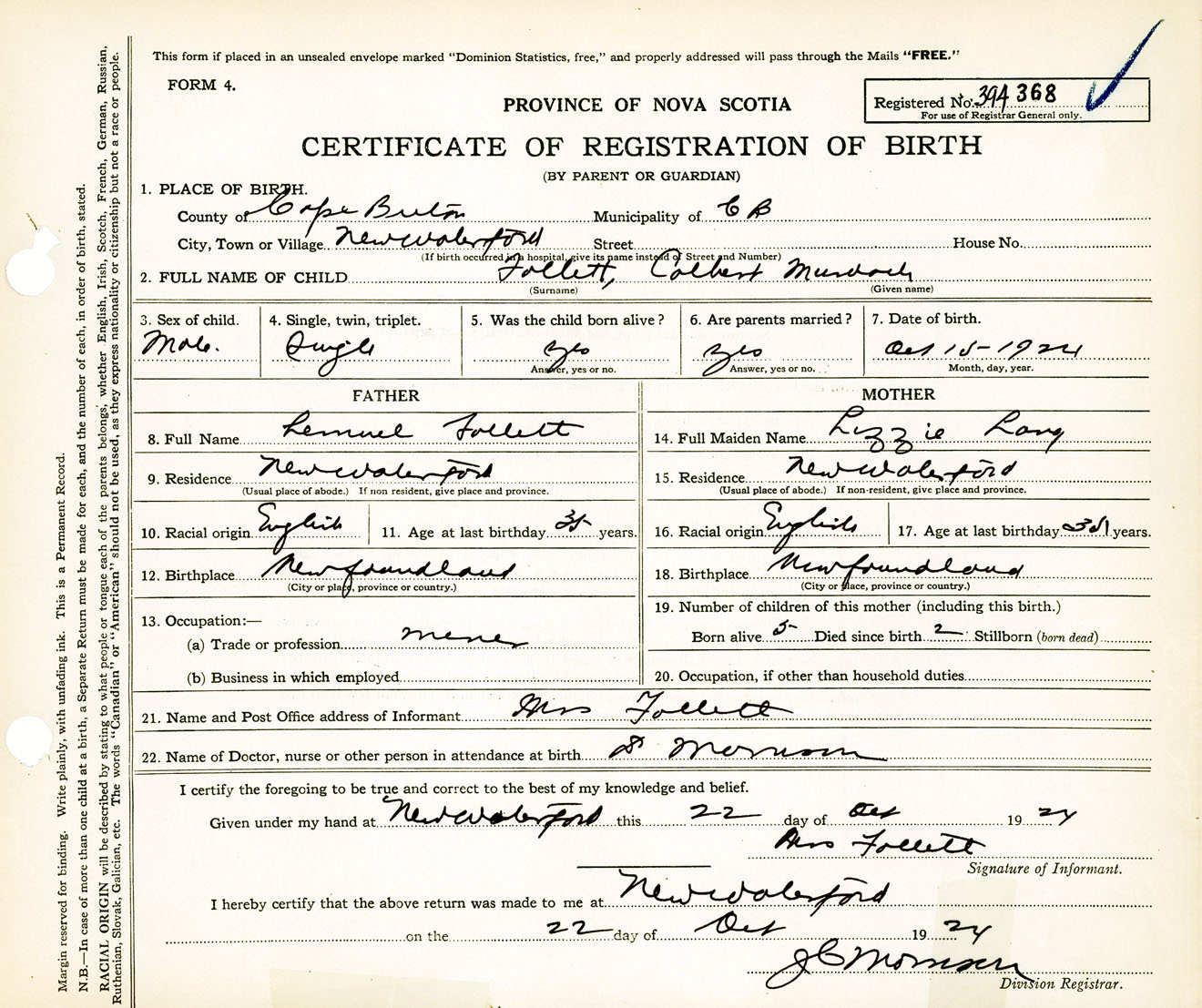 Male Birth Registration: Year: 1924 number: 39400368