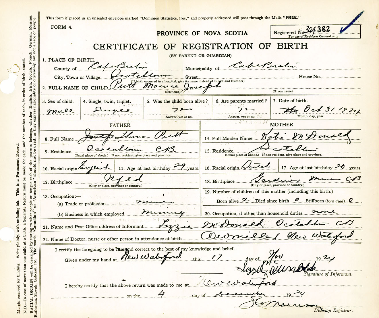Male Birth Registration: Year: 1924 number: 39400382