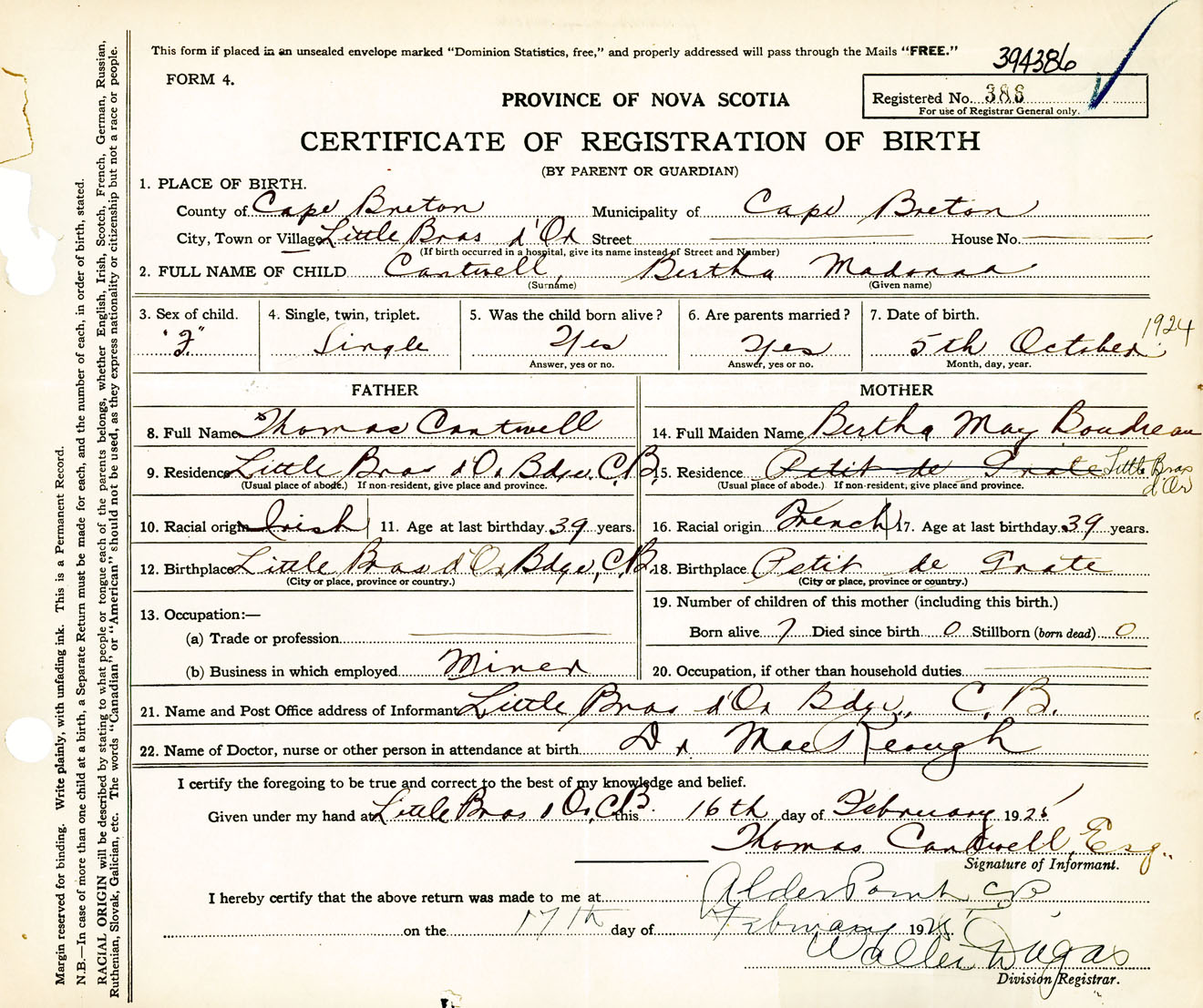 Female Birth Registration: Year: 1924 number: 39400386
