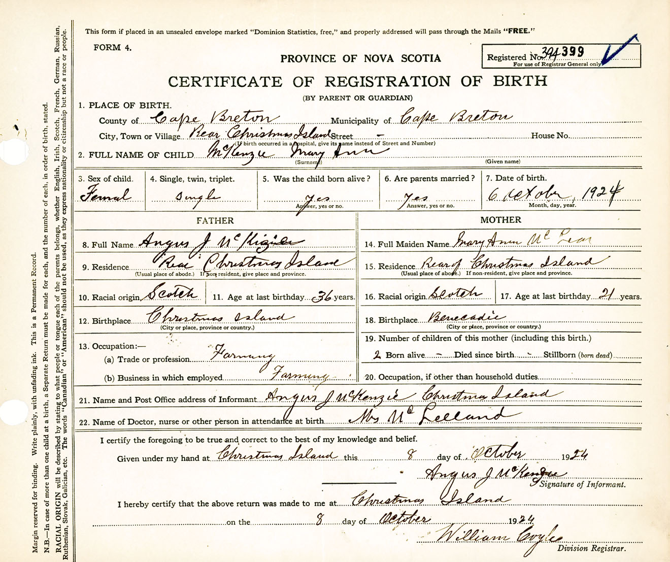 Female Birth Registration: Year: 1924 number: 39400399