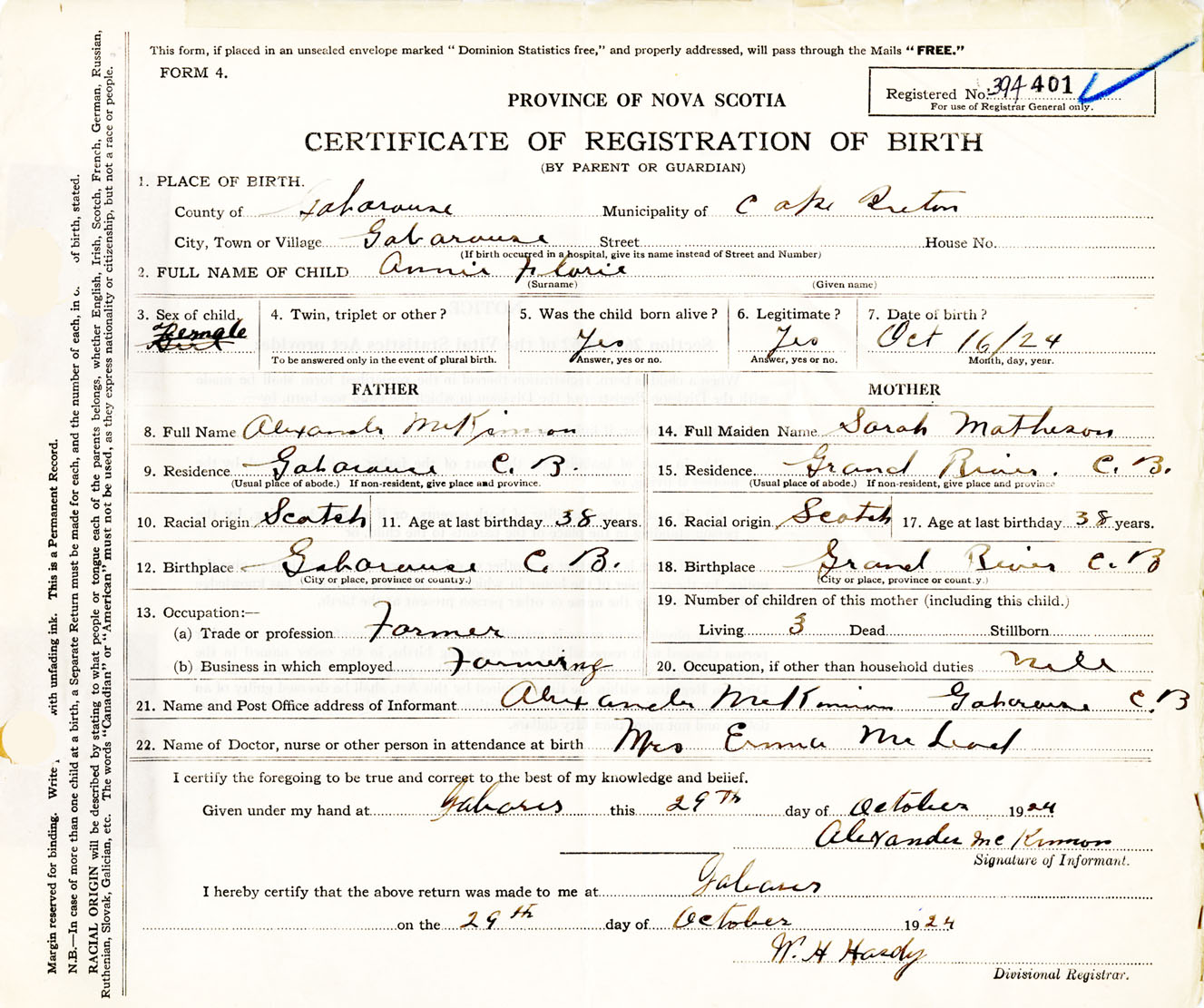 Female Birth Registration: Year: 1924 number: 39400401
