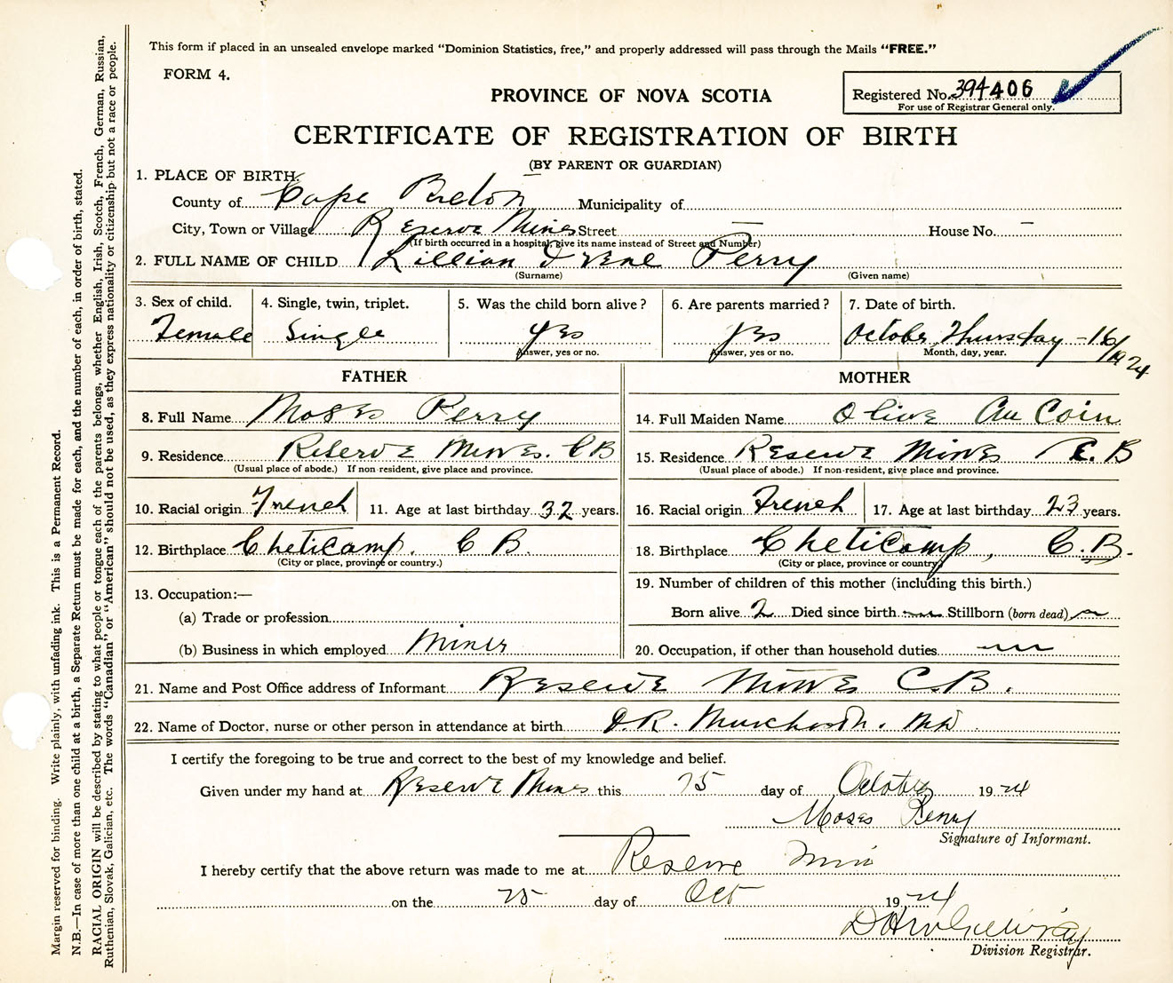 Female Birth Registration: Year: 1924 number: 39400406