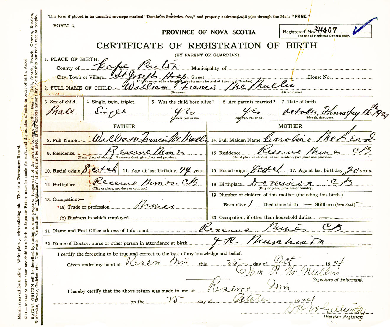 Male Birth Registration: Year: 1924 number: 39400407