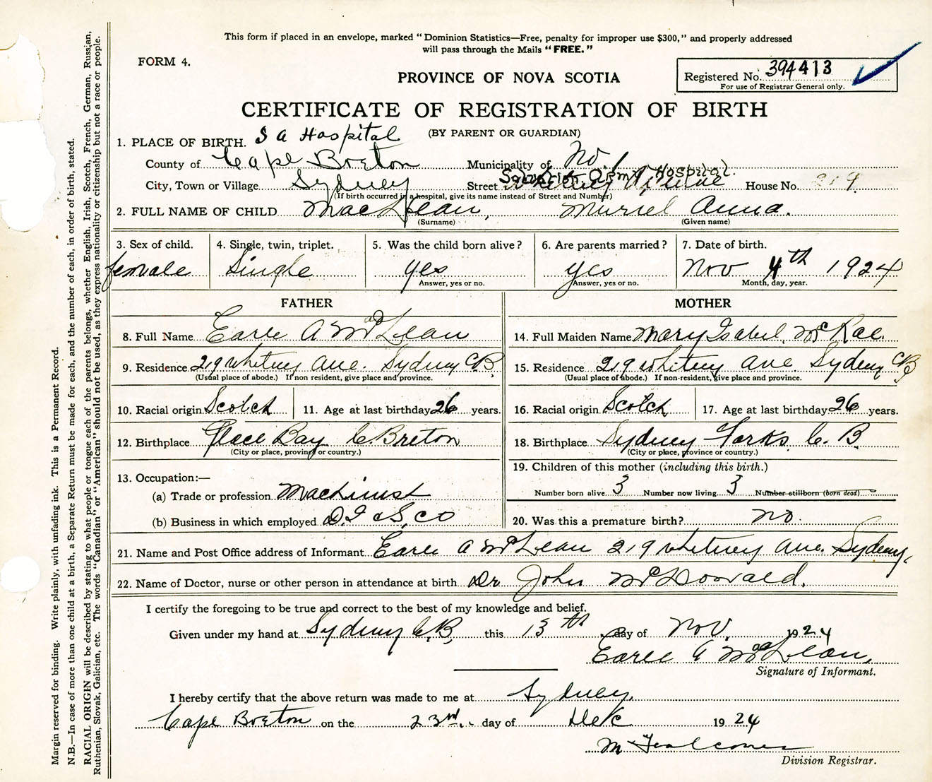 Female Birth Registration: Year: 1924 number: 39400413