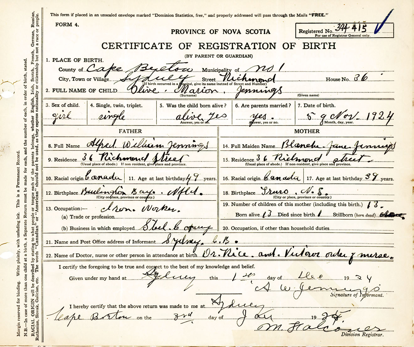 Female Birth Registration: Year: 1924 number: 39400415