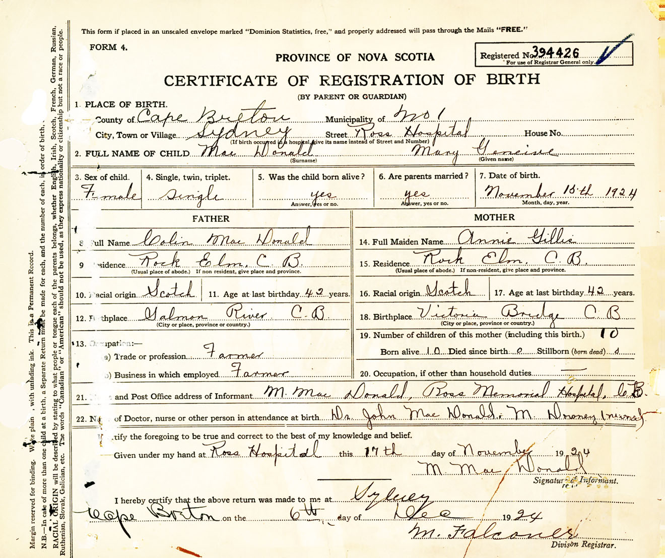 Female Birth Registration: Year: 1924 number: 39400426