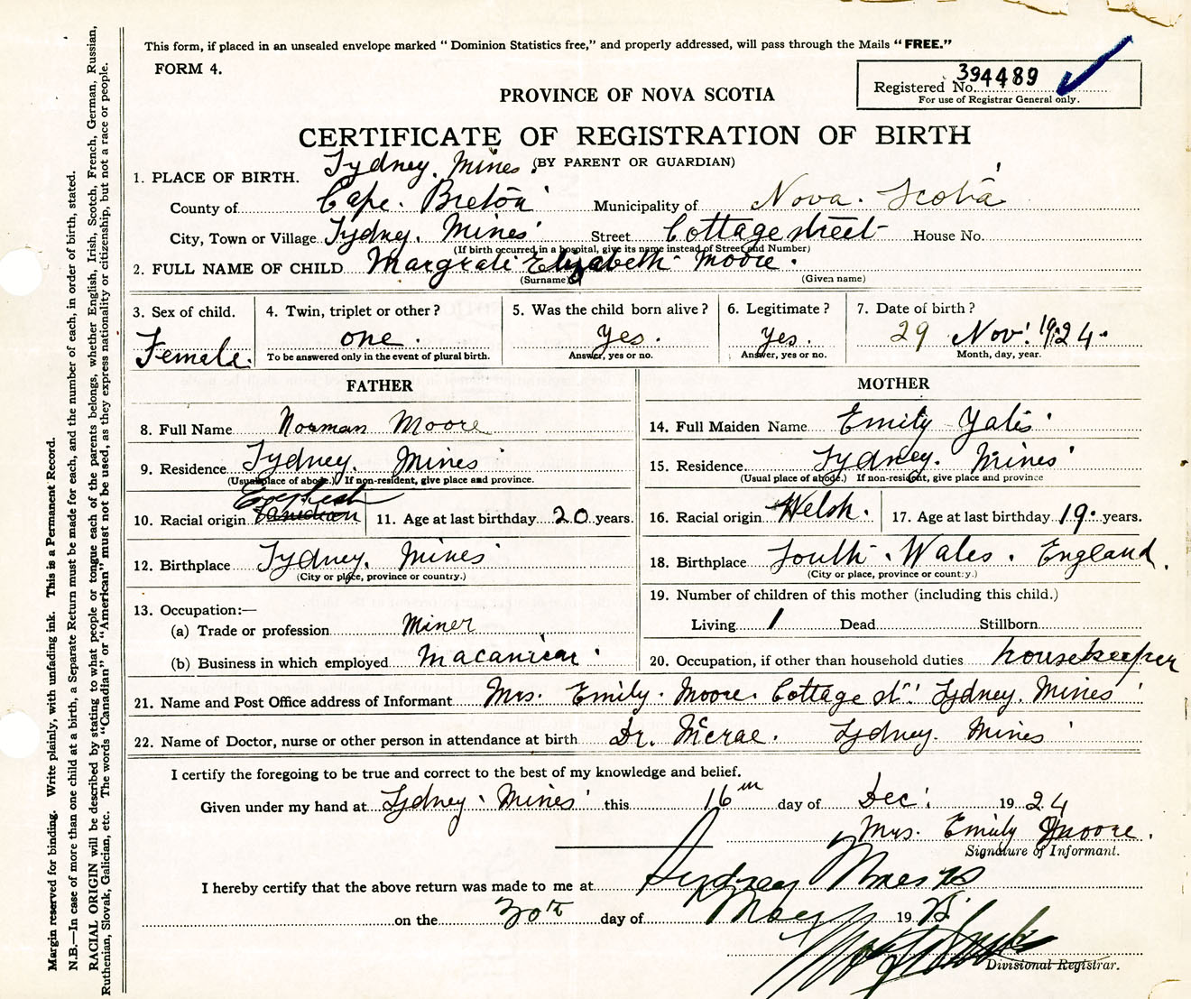 Female Birth Registration: Year: 1924 number: 39400489
