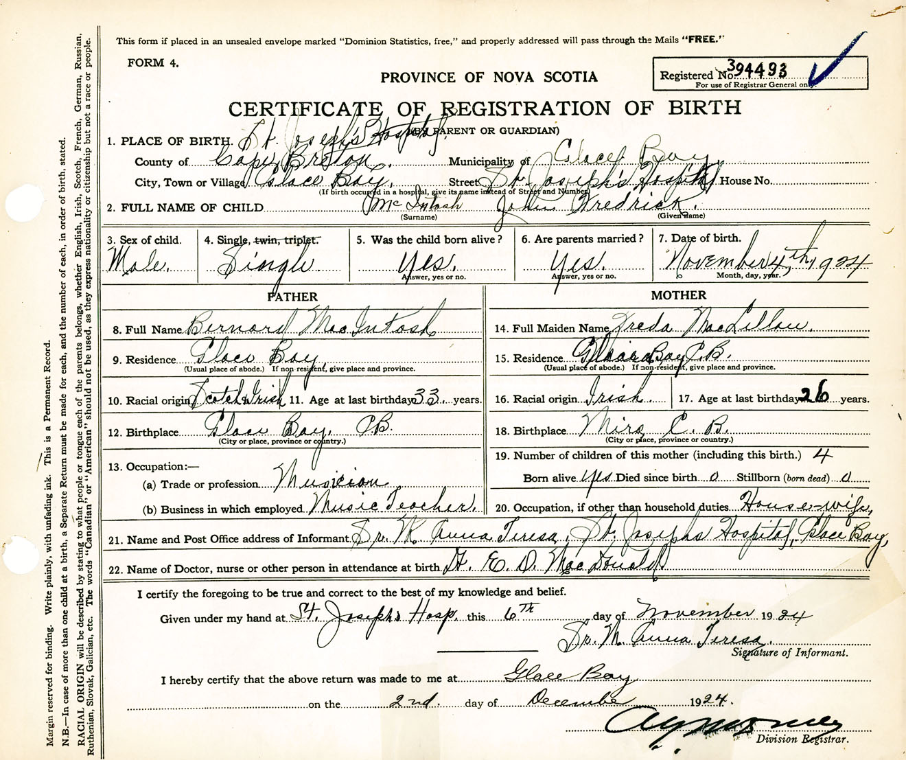 Male Birth Registration: Year: 1924 number: 39400493