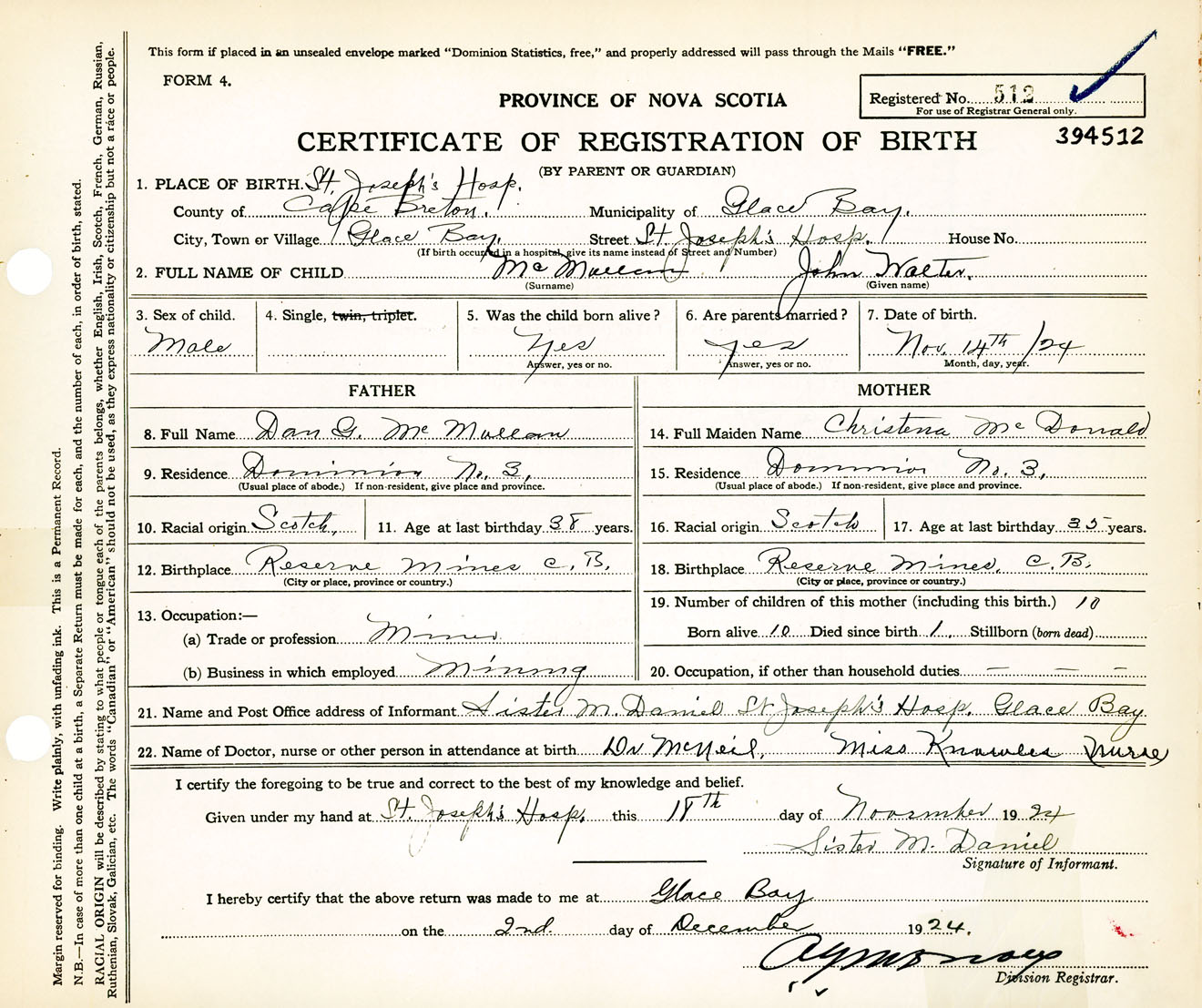 Male Birth Registration: Year: 1924 number: 39400512