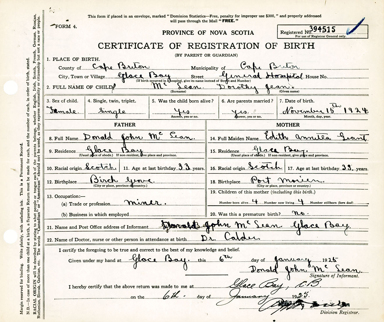 Female Birth Registration: Year: 1924 number: 39400515