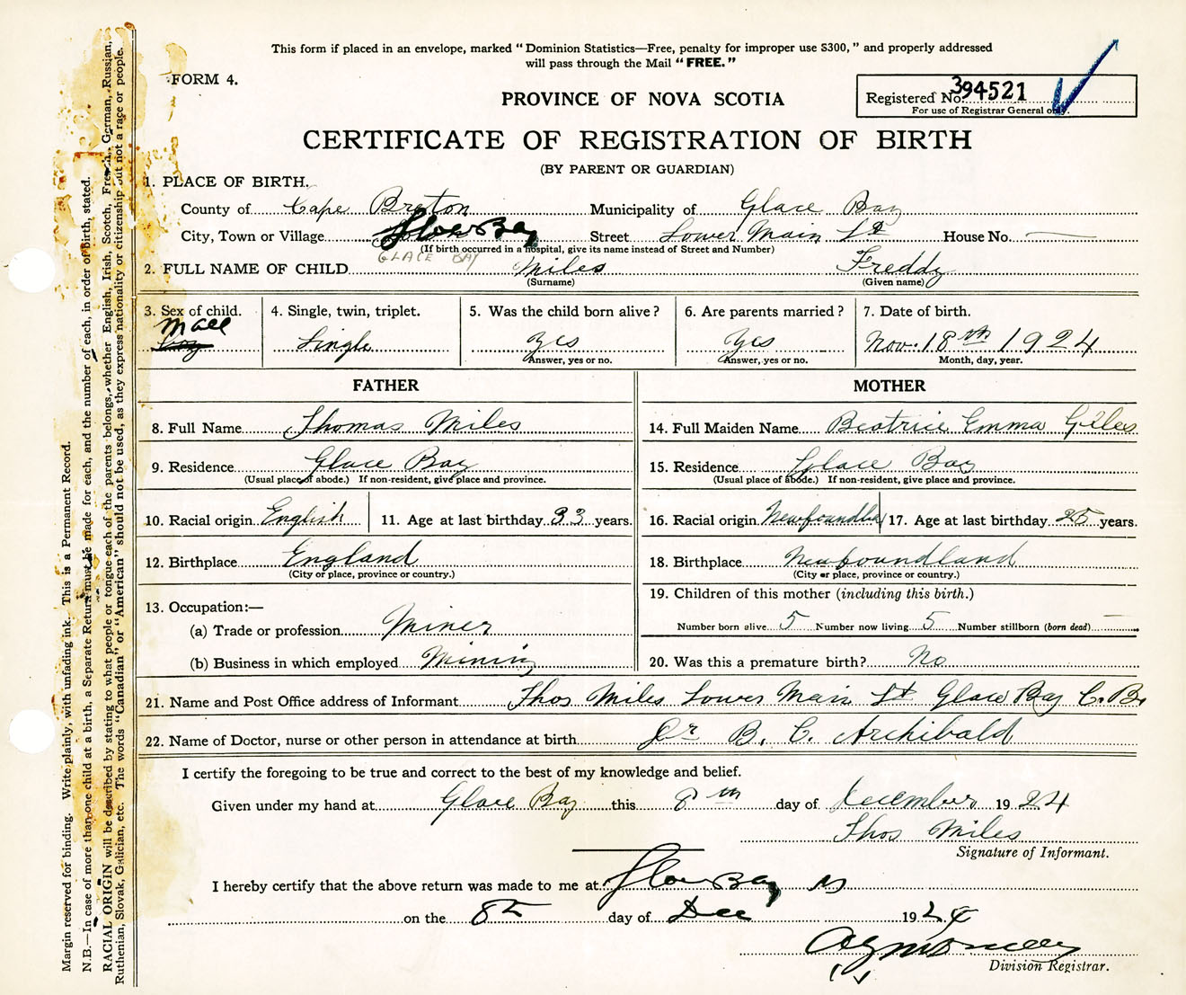 Male Birth Registration: Year: 1924 number: 39400521