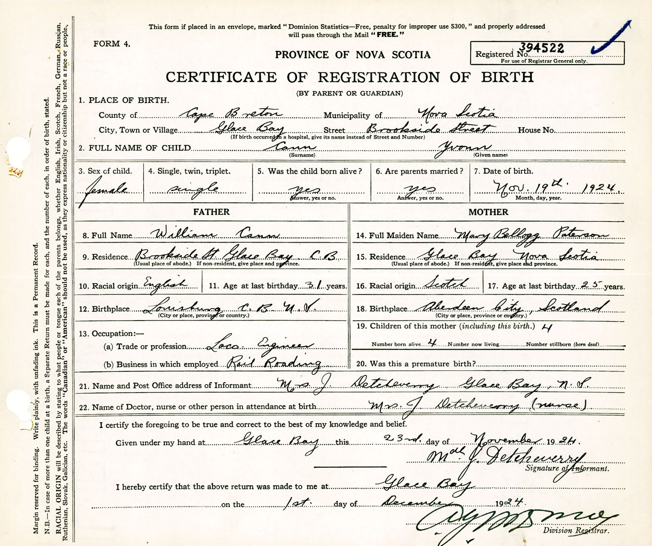 Female Birth Registration: Year: 1924 number: 39400522