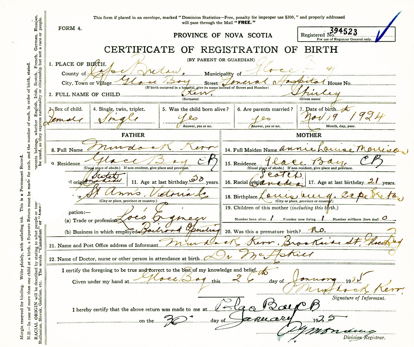 Female Birth Registration: Year: 1924 number: 39400523
