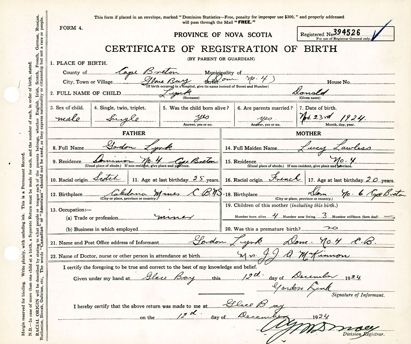 Male Birth Registration: Year: 1924 number: 39400526