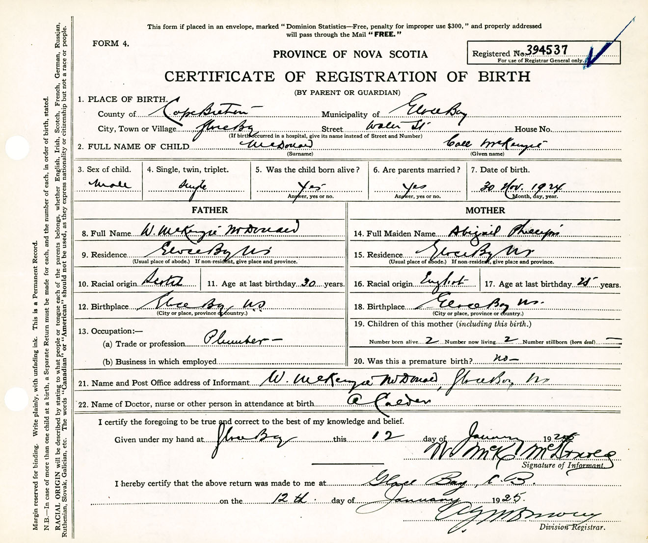 Male Birth Registration: Year: 1924 number: 39400537