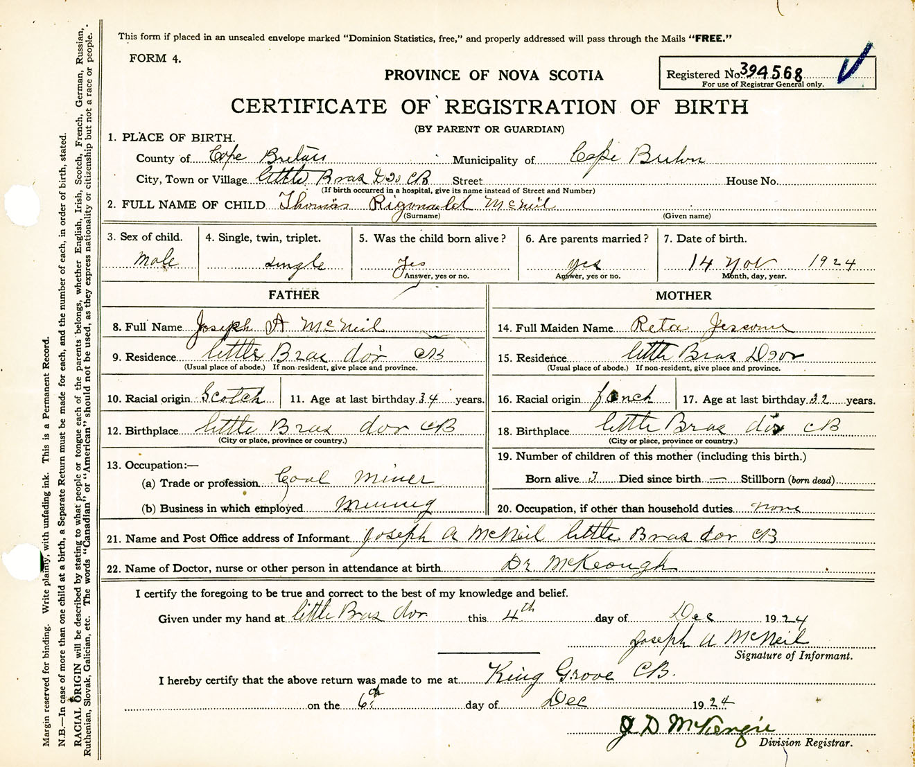 Male Birth Registration: Year: 1924 number: 39400568