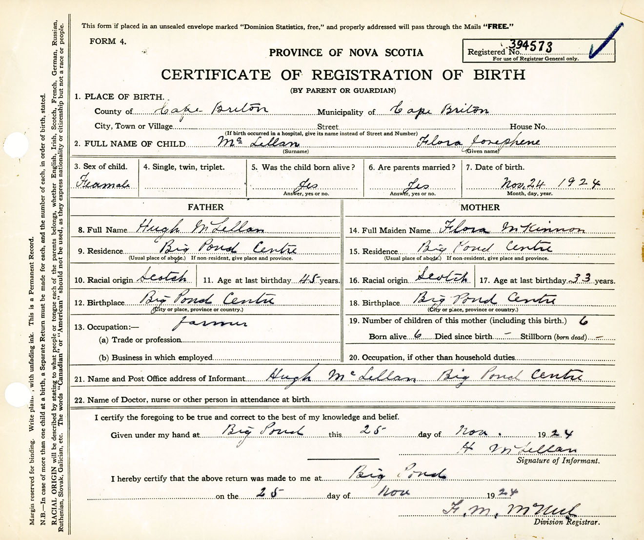 Female Birth Registration: Year: 1924 number: 39400573